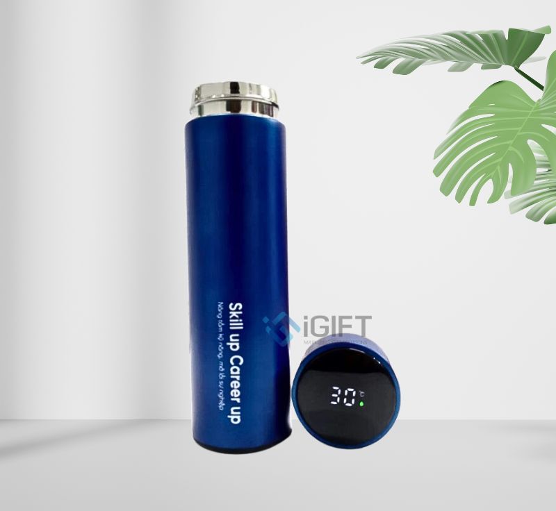 - Bình nước in logo có báo nhiệt độ: Bình nước giữ nhiệt thông thường được cải tiến thêm màn hình thể hiện nhiệt độ thực của đồ uống giúp người sử dụng nhận biết và luôn đảm bảo được nước đang ở một nhiệt độ lý tưởng. Đây là món quà vừa thời trang, vừa tiện dụng, phù hợp với những người bận rộn.