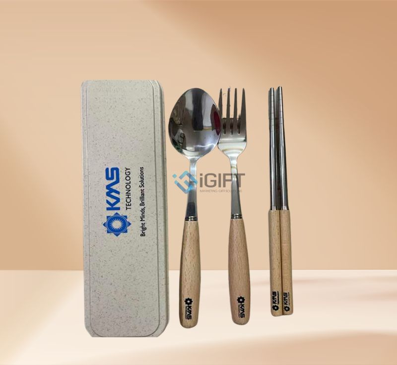- Bộ sản phẩm đũa, muỗng inox cán gỗ in logo: Là sự kết hợp giữa vật liệu truyền thống kết hợp với hiện đại bởi tay cầm được làm bằng gỗ sồi, thân làm từ inox chống gỉ, hộp đựng làm từ lúa mạch. Vì thế, toàn bộ sản phẩm rất an toàn cho sức khỏe người sử dụng, đặc biệt thích hợp cho những khách hàng là nội trợ, dân văn phòng hoặc thậm chí là các bạn học sinh, sinh viên.