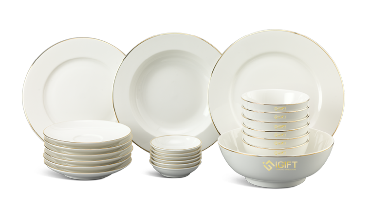 iGIFT cung cấp dịch vụ in logo theo yêu cầu trên từng sản phẩm bộ đồ ăn Jasmine. Logo có thể in bằng vàng ánh kim hoặc nhũ vàng nổi bật, hài hòa với thiết kế viền chỉ vàng. Đây là cách để doanh nghiệp để lại dấu ấn thương hiệu bền vững trong đời sống hàng ngày của khách hàng, đối tác.