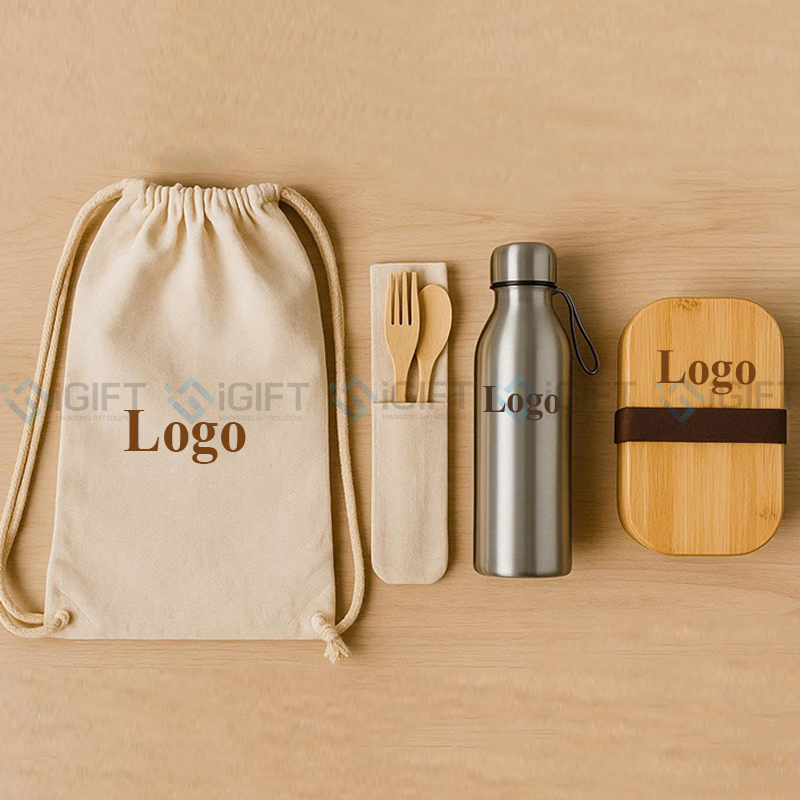 Bộ sản phẩm bao gồm: Túi canvas hoặc balo dây rút, bình giữ nhiệt, hộp cơm và bộ đũa thìa văn phòng