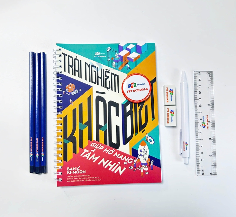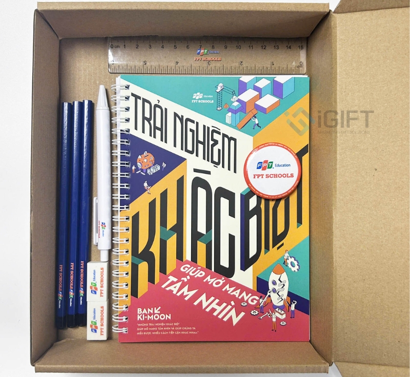 Bộ quà tặng bao gồm 1 sổ tay lò xo, 1 bút bi, 2 gôm tẩy, 3 bút bì, 1 thước kẻ và 1 huy hiệu cài áo - Tất cả đều được in ấn logo FPT Schools. Bộ quà được đánh giá cao bởi sự đa dạng, đầy đủ cho 1 bộ dụng cụ học tập cơ bản, thiết kế nhỏ gọn và đồng bộ logo thương hiệu với nhau.