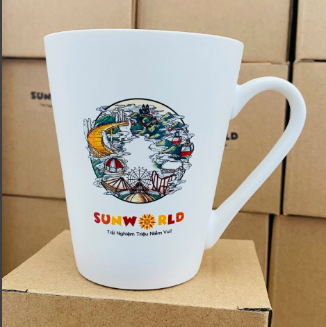 Công nghệ in ấn hiện đại in từng mảng màu đa sắc, chất lượng hoàn hảo giúp hiển thị hình ảnh Bà Nà Hill, Cầu Vàng, khu vui chơi giải trí của Sungroup được hiển thị trên mặt ly sứ rực rỡ tả thực.