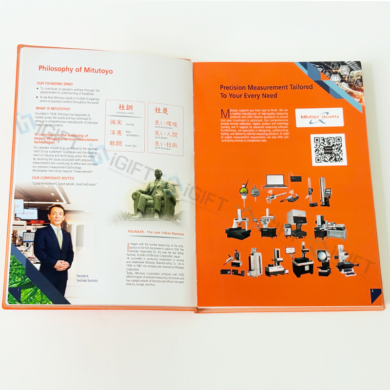 Sổ được thiết kế với bìa da cao cấp, tạo cảm giác chắc chắn, lịch sự và chuyên nghiệp. Logo Mitutoyo được dập chìm tinh xảo ngay trên bề mặt bìa, mang đến sự tinh tế và đẳng cấp cho sản phẩm. Đây là một trong những phương pháp in ấn giúp logo bền đẹp, không phai màu theo thời gian.
