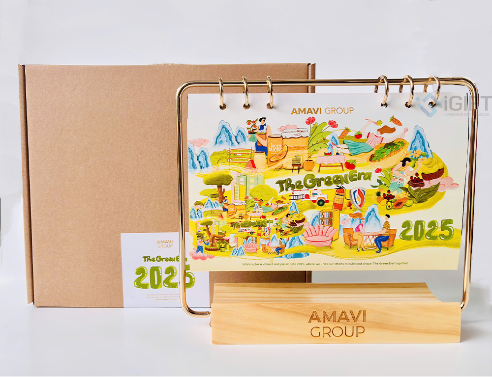 - Thiết kế hộp – túi đồng bộ với lịch gỗ, in logo thương hiệu.