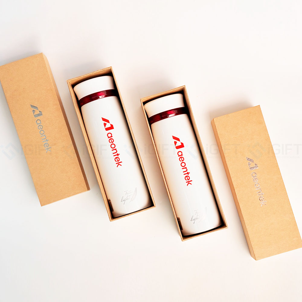Song hành cùng quạt điện là bình giữ nhiệt – món quà có giá trị sử dụng bốn mùa. Các dòng sản phẩm đến từ Lock&Lock, Thermos, Elmich hay Stanley đều được ưa chuộng nhờ khả năng giữ nhiệt tốt, thiết kế tinh tế và độ bền cao. Logo được in hoặc khắc laser trên thân bình giúp tạo ấn tượng sang trọng, bền màu theo thời gian. Chính sự kết hợp này mang lại cho bộ quà sự cân bằng: vừa tiện ích trước mắt, vừa gắn bó dài hạn.