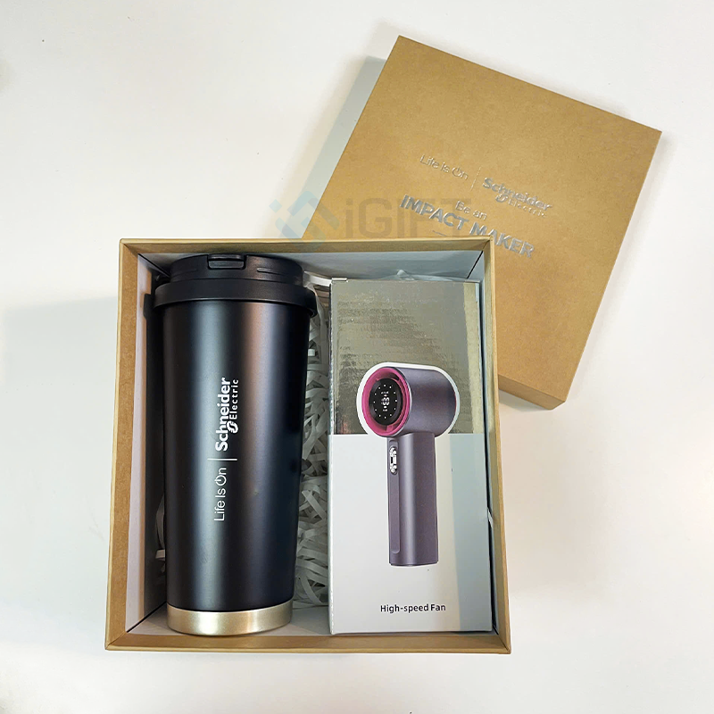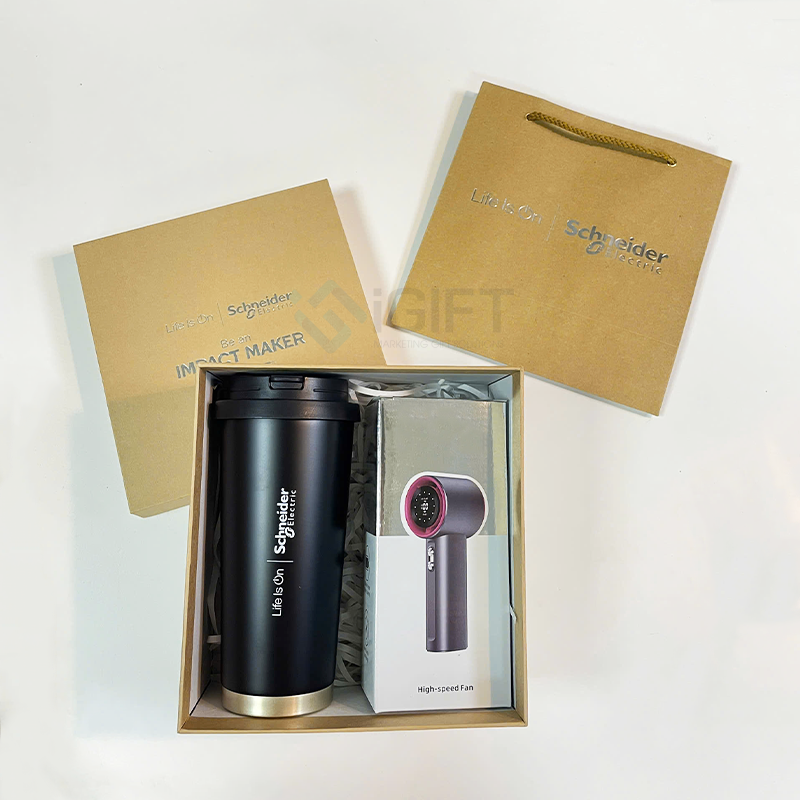 Sự kết hợp giữa quạt điện mini và bình giữ nhiệt trong hộp kraft không chỉ mang lại sự tiện lợi cho người nhận mà còn giúp thương hiệu hiện diện một cách tự nhiên, lặp đi lặp lại trong sinh hoạt hằng ngày. Đây là lựa chọn hoàn hảo cho quà tặng khách hàng, đối tác, quà tri ân nhân viên hay quà sự kiện. Đặc biệt, với dịch vụ in ấn đồng bộ, doanh nghiệp dễ dàng xây dựng hình ảnh thương hiệu nhất quán và chuyên nghiệp.