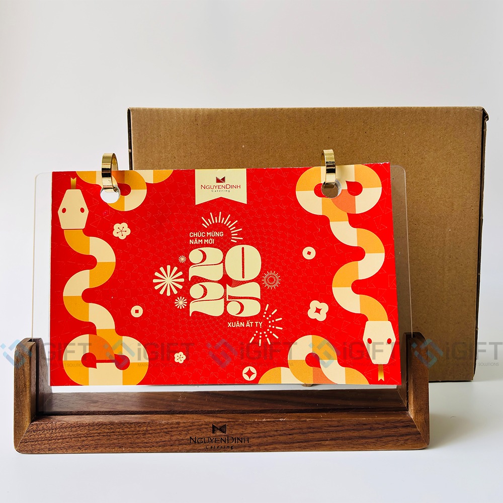 Lịch để bàn đế gỗ là món quà hữu ích và sang trọng, được ưa chuộng trong các dịp tặng quà Tết. Đây cũng là cơ hội để doanh nghiệp truyền tải thông điệp về sự chuyên nghiệp và bền vững. Lịch đế gỗ thường được làm từ chất liệu gỗ tự nhiên, mang lại cảm giác sang trọng và thân thiện với môi trường. Các trang lịch in hình ảnh phong cảnh Việt Nam, những câu chúc Tết hay các lời nhắn gửi ý nghĩa. Doanh nghiệp có thể in logo và tên công ty lên phần đế hoặc trên mỗi trang lịch, giúp tăng cường nhận diện thương hiệu. Ngoài mục đích sử dụng để theo dõi ngày tháng, lịch đế gỗ còn là một món quà trang trí tinh tế cho bàn làm việc.