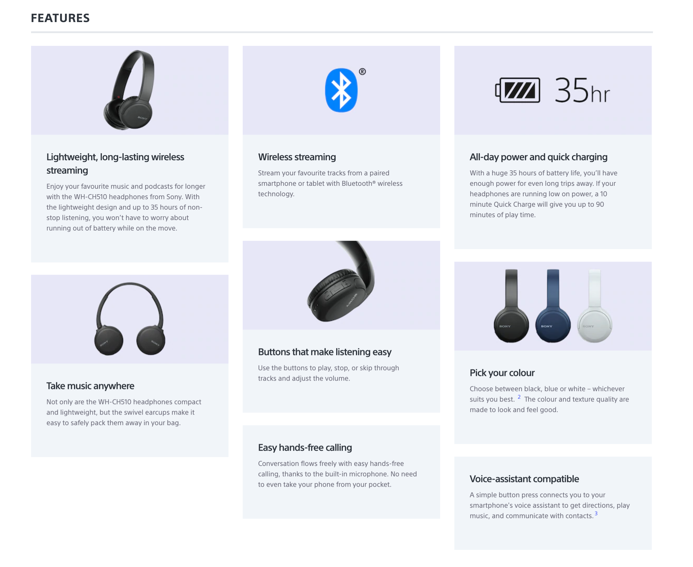 Bên trong WH-CH510 sử dụng một driver đường kính 30mm được chú trọng đến độ cân bằng của cả ba dải và chất âm dễ nghe phù hợp nhiều thể loại nhạc. Sản phẩm được trang bị chuẩn Bluetooth 5.0 cùng với các codec SBC và AAC. Sony WH-CH510 có hỗ trợ trợ lý ảo thông minh Siri và Google với cụm điều khiển bằng nút bấm ở mặt dưới ear-cup.