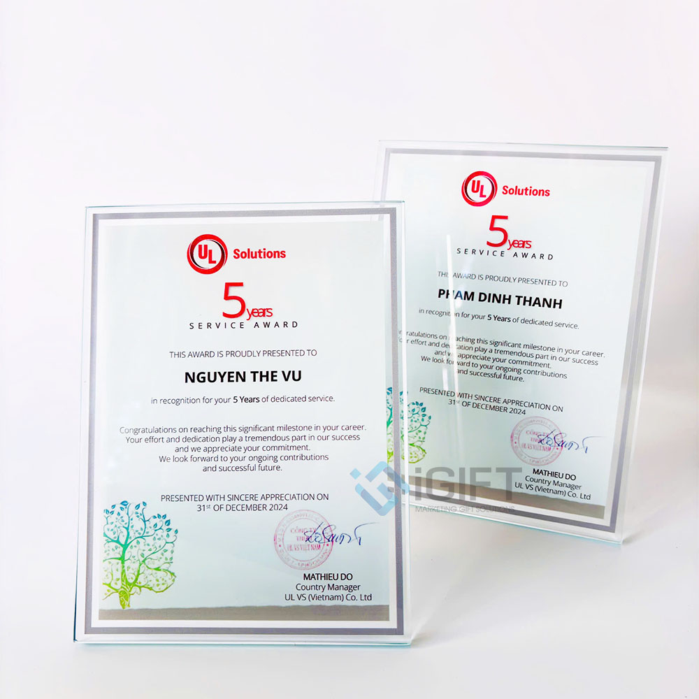 Bằng khen từ lâu đã trở thành biểu tượng của sự ghi nhận và vinh danh những nỗ lực, thành tựu xuất sắc. Với thiết kế hiện đại và chất liệu thủy tinh cao cấp, bằng khen thủy tinh in logo UL Solution không chỉ mang lại vẻ đẹp sang trọng mà còn thể hiện giá trị đẳng cấp cho người nhận.