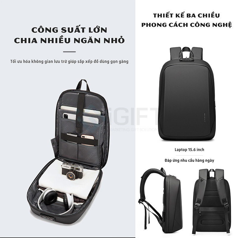 Ngăn chứa được chia khoa học, đựng vừa laptop 15.6 inch, máy tính bảng, tài liệu và đồ dùng cá nhân. Quai đeo và lưng balo được thiết kế công thái học, giảm áp lực khi đeo lâu và tạo cảm giác thoải mái suốt ngày dài làm việc hoặc di chuyển.