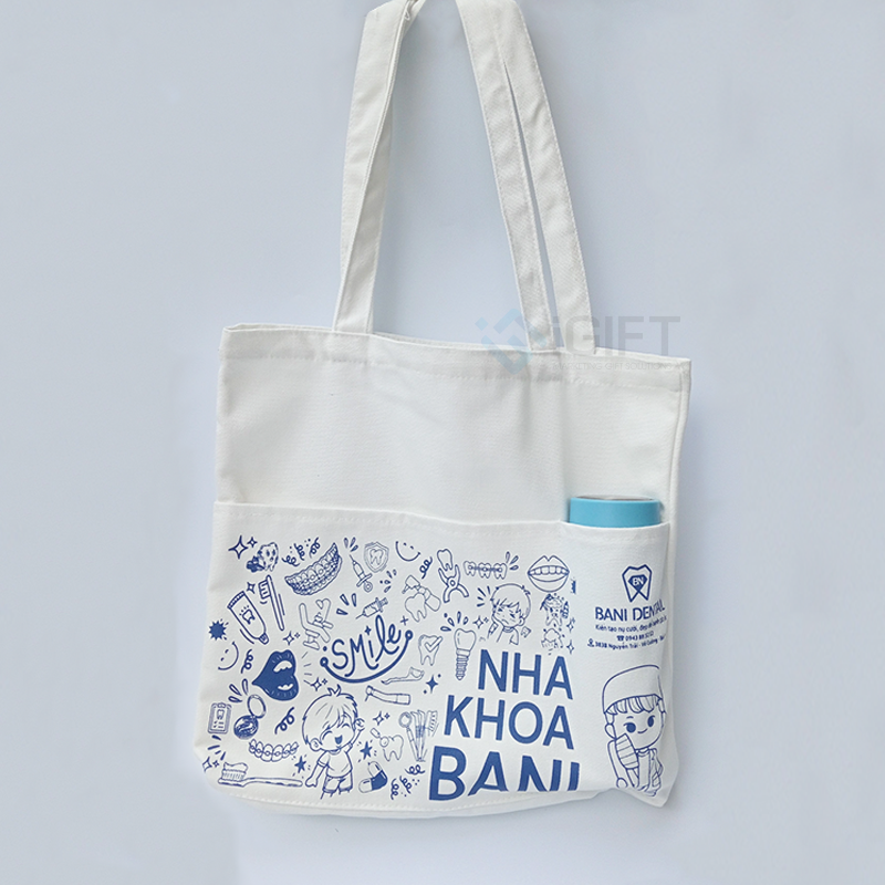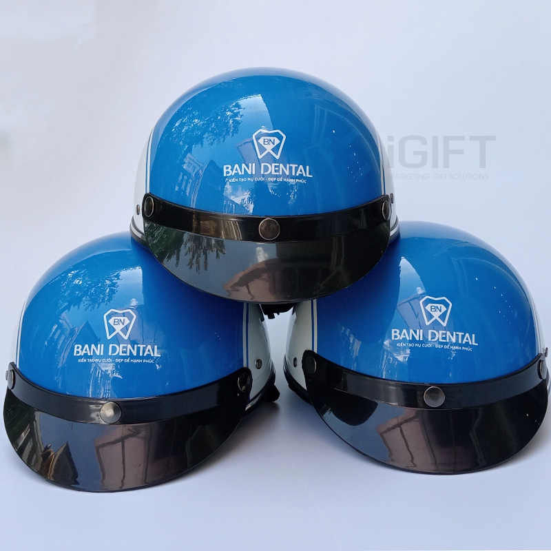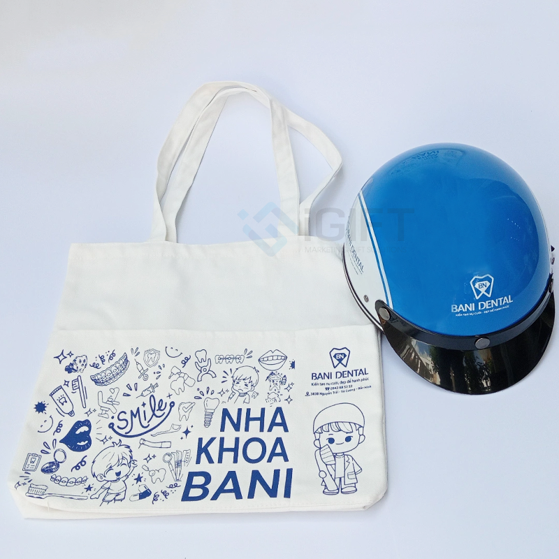Bộ quà tặng gồm mũ bảo hiểm, túi canvas và gối cổ in logo Nha Khoa Bani là sự kết hợp hoàn hảo giữa tính thiết thực và khả năng quảng bá thương hiệu. Mỗi sản phẩm đều mang giá trị sử dụng cao trong đời sống hàng ngày, từ di chuyển, làm việc đến du lịch.
