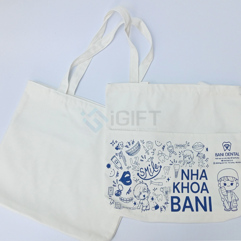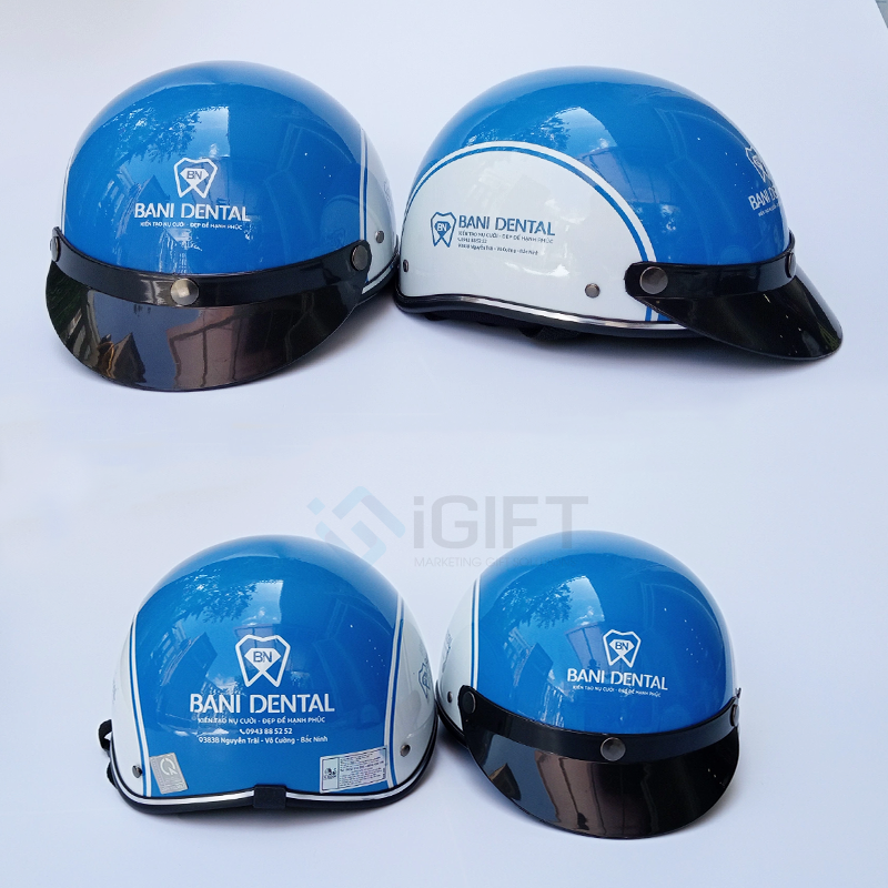 Bộ quà tặng gồm mũ bảo hiểm, túi canvas và gối cổ in logo Nha Khoa Bani là sự kết hợp hoàn hảo giữa tính thiết thực và khả năng quảng bá thương hiệu. Mỗi sản phẩm đều mang giá trị sử dụng cao trong đời sống hàng ngày, từ di chuyển, làm việc đến du lịch.