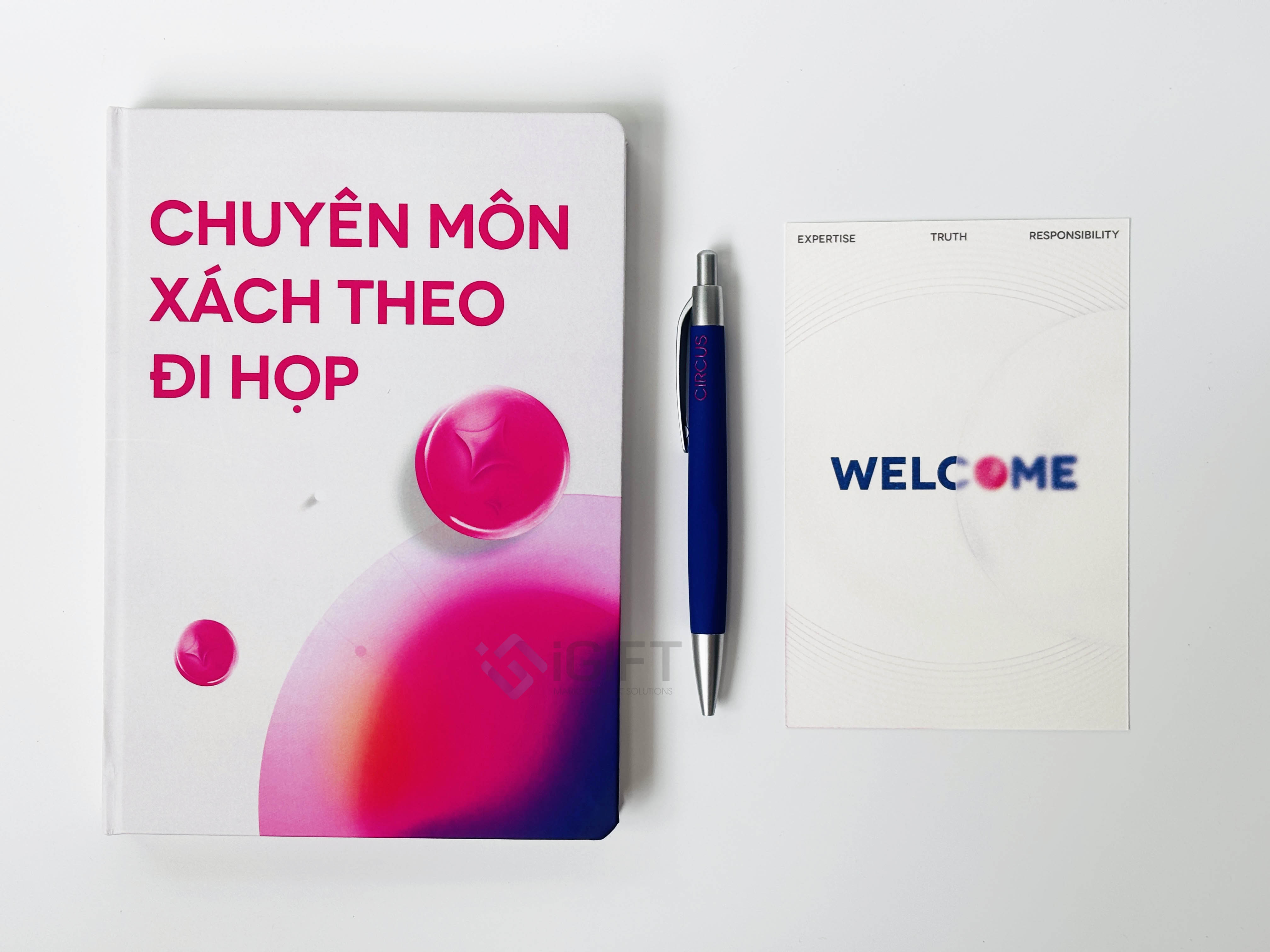 Sổ tay A5 với thiết kế hiện đại, được dán gáy chắc chắn, tạo điều kiện thuận lợi cho việc ghi chép và sử dụng. Bút bi vừa vặn trong tay và dễ dàng mang theo. Thiệp welcome góp phần tô điểm cho bộ sản phẩm với không gian phù hợp để in logo và thông điệp của CIRCUS.
