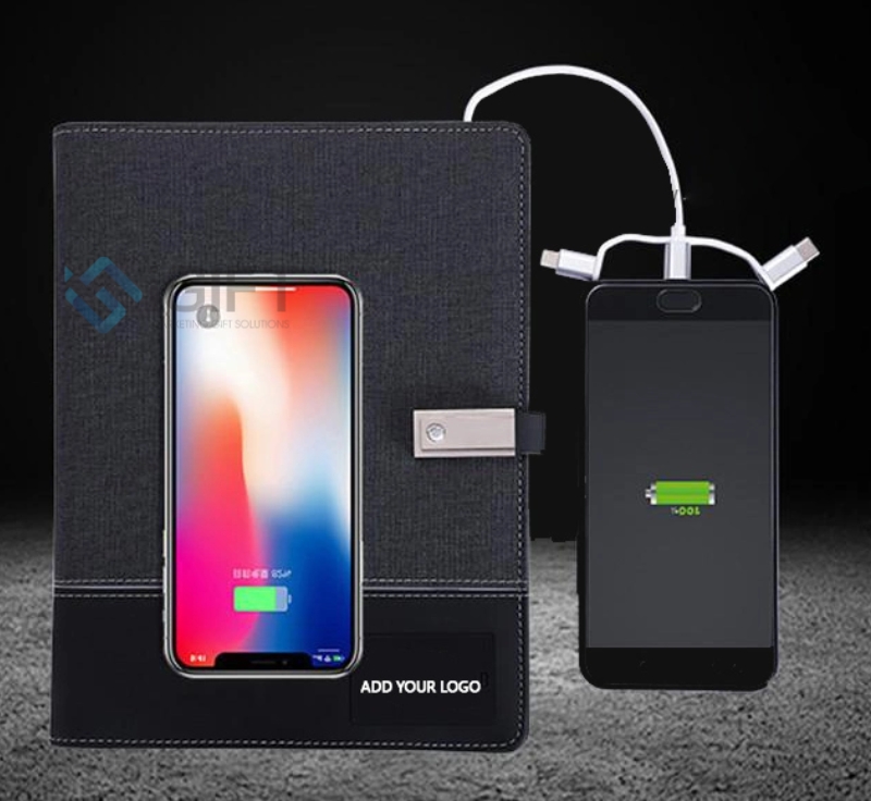 Sổ được làm từ chất liệu da PU cao cấp với Pin dung lượng từ 8000mAh - 10.000mAh. Sổ Đa năng tích hợp giữa sổ còng tiện lợi và pin dự phòng với cáp sạc 3 in 1. Bề mặt còn tích hợp thêm sạc không dây thông minh, USB 16GB nhỏ gọn và có thể khắc logo led phát sáng đa sắc màu. Tạo nên một sản phẩm công nghệ thông minh và đa năng, công nghệ in ấn cá nhân hóa cũng sẽ giúp người nhận yêu thích và ấn tượng với món quà này.