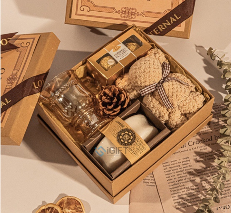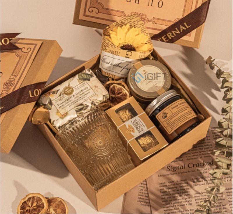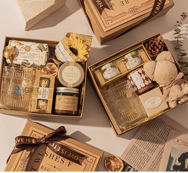 Trong một hộp quà hoàn chỉnh có từ 3 sản phẩm trở lên, khách hàng có thể tùy ý lựa chọn các sản phẩm khác nhau để làm thành bộ quà hoàn chỉnh, được trang trí, in logo tỉ mỉ cũng như được đựng trong hộp và túi nơ chu đáo.