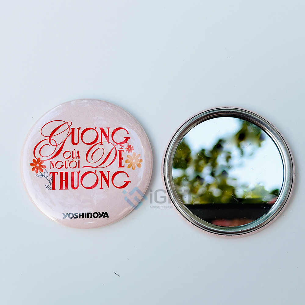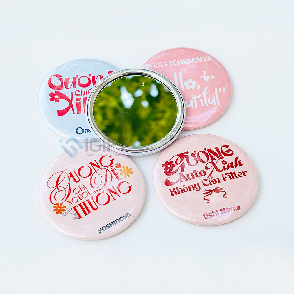 Một trong những điểm nổi bật của gương tròn mini là khả năng in logo theo yêu cầu trên mặt lưng sản phẩm. Đây là một trong những cách quảng bá thương hiệu tinh tế nhưng hiệu quả, giúp doanh nghiệp tạo dấu ấn trong tâm trí khách hàng. Logo có thể được in theo nhiều kiểu dáng, màu sắc tùy chỉnh, phù hợp với bộ nhận diện thương hiệu của từng doanh nghiệp.