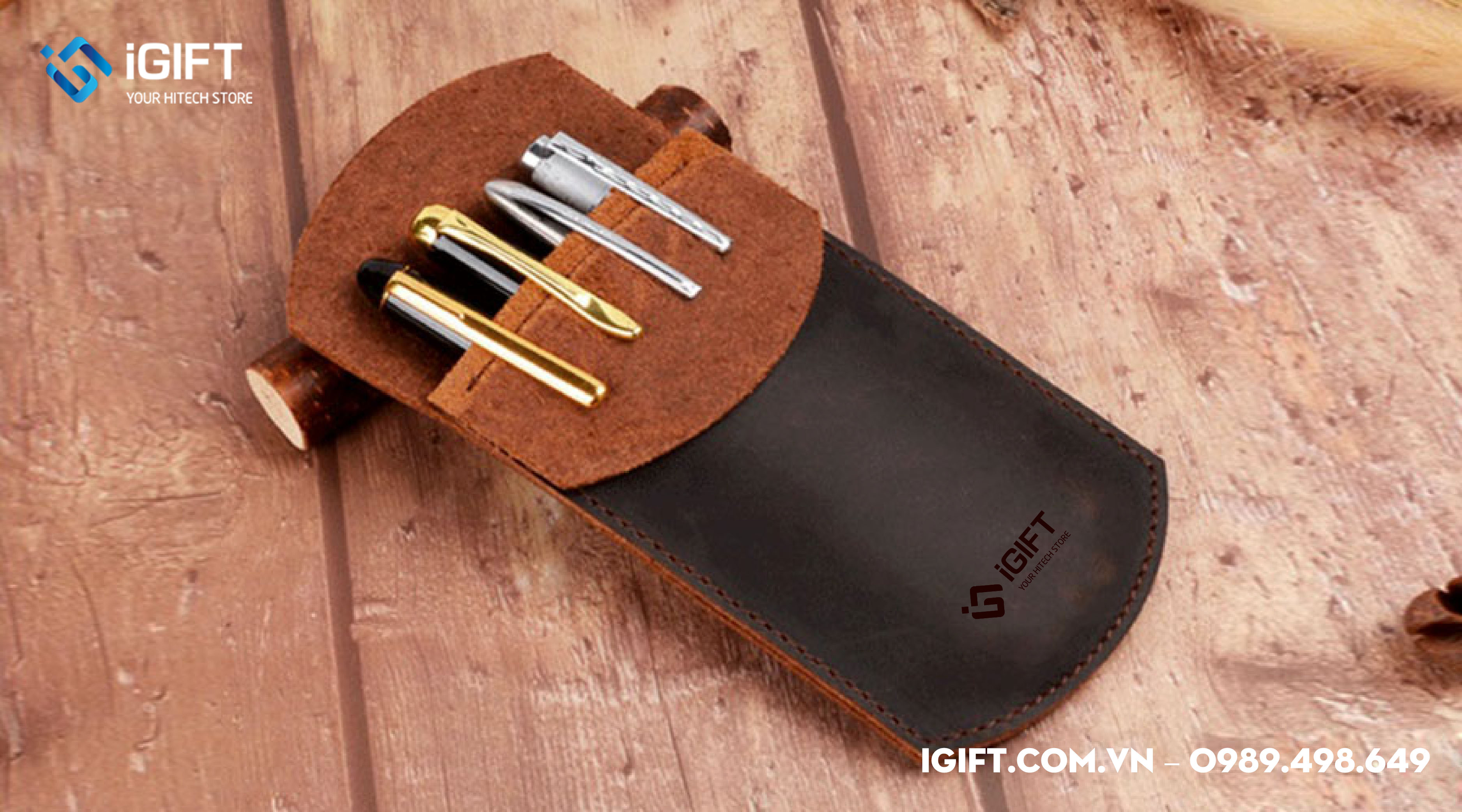 2. Túi đựng bút bằng da: thường được thiết kế dài theo độ dài trung bình của cây bút, có loại kéo khóa đựng thêm được vật dụng cá nhân khác, cũng có loại hở đầu để cài bút, đều thuận tiện để khách hàng dễ dàng lấy bút ra ghi chép hoặc ký nhận trong quá trình làm việc.
