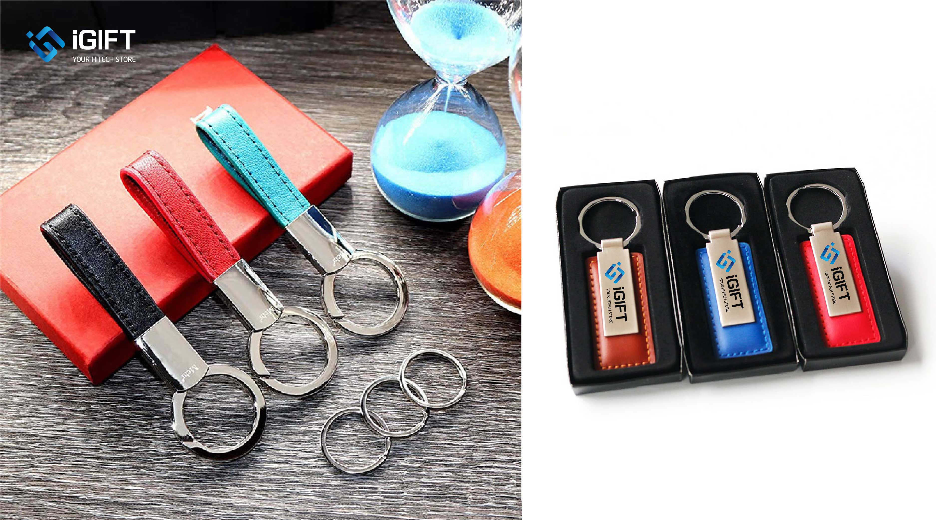 3. Móc khóa bằng da: gồm móc khóa tròn kim loại kèm một miếng da hình chữ nhật được khắc logo lên. Sản phẩm này là quà tặng phổ biến trong các dịp hội nghị, sự kiện, triển lãm hoặc ra mắt sản phẩm mới, vì giá cả hết sức hợp lý, còn khi tặng khách hàng vip thì thường được phối chung với các sản phẩm khách như hộp namecard, usb da, sổ da…tạo thành bộ giftset sang trọng, tri ân khách hàng.