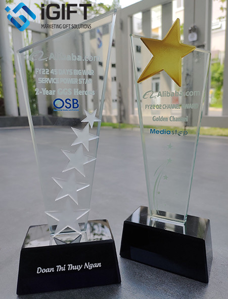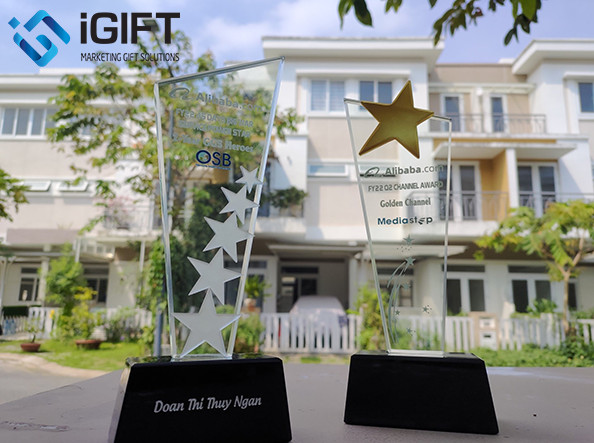 Kỷ niệm chương tại iGIFT được làm từ chất liệu thủy tinh hoặc pha lê tùy theo nhu cầu của khách hàng. Khách được phối màu, in tên hoặc logo tùy chọn.