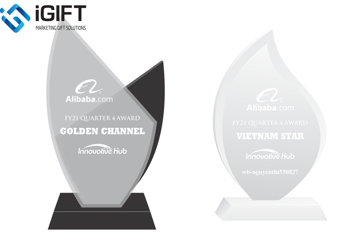 Kỷ niệm chương tại iGIFT được làm từ chất liệu thủy tinh hoặc pha lê tùy theo nhu cầu của khách hàng. Khách được phối màu, in tên hoặc logo tùy chọn.