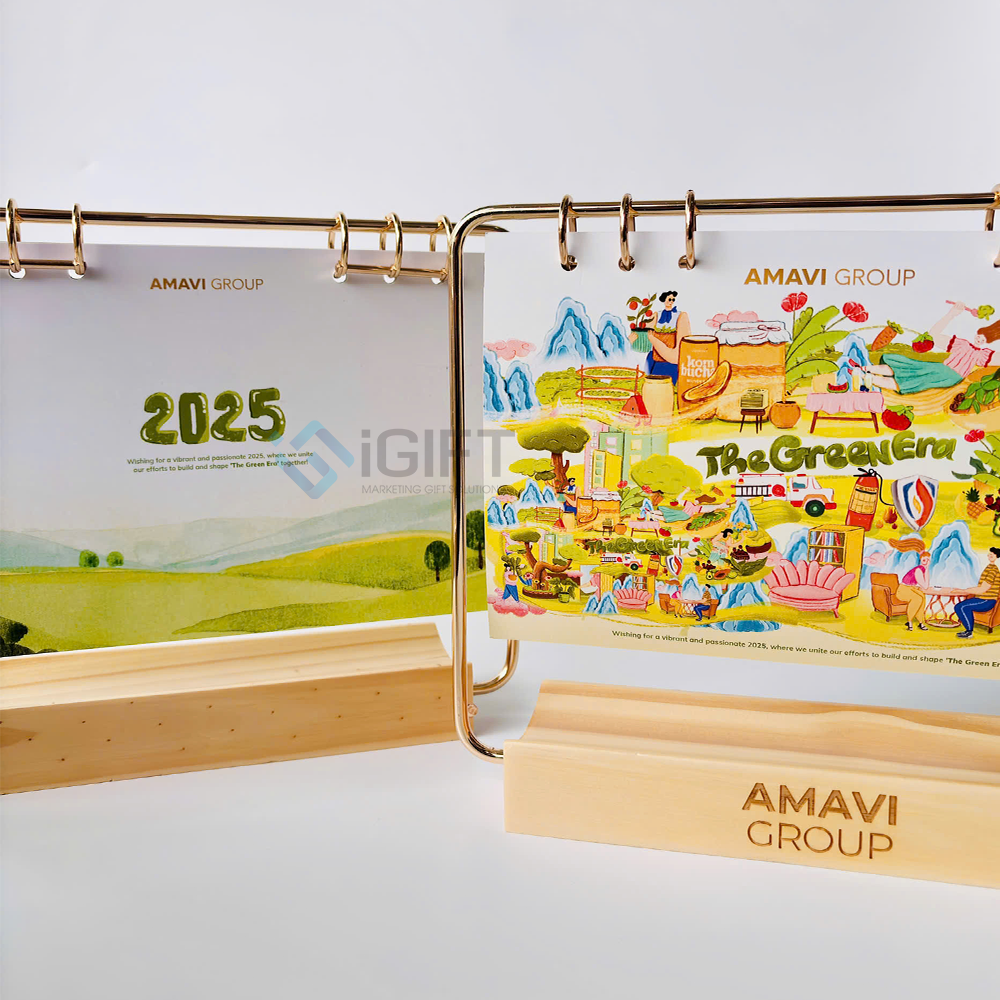 iGIFT cung cấp dịch vụ sản xuất và gia công lịch để bàn đế gỗ theo yêu cầu, hỗ trợ khách hàng từ khâu thiết kế, in ấn, khắc logo đến đóng gói hoàn thiện. Với MOQ từ 200pcs, doanh nghiệp có thể tùy chỉnh chất liệu, kích thước, màu sắc, kiểu dáng và bao bì theo nhận diện thương hiệu riêng.