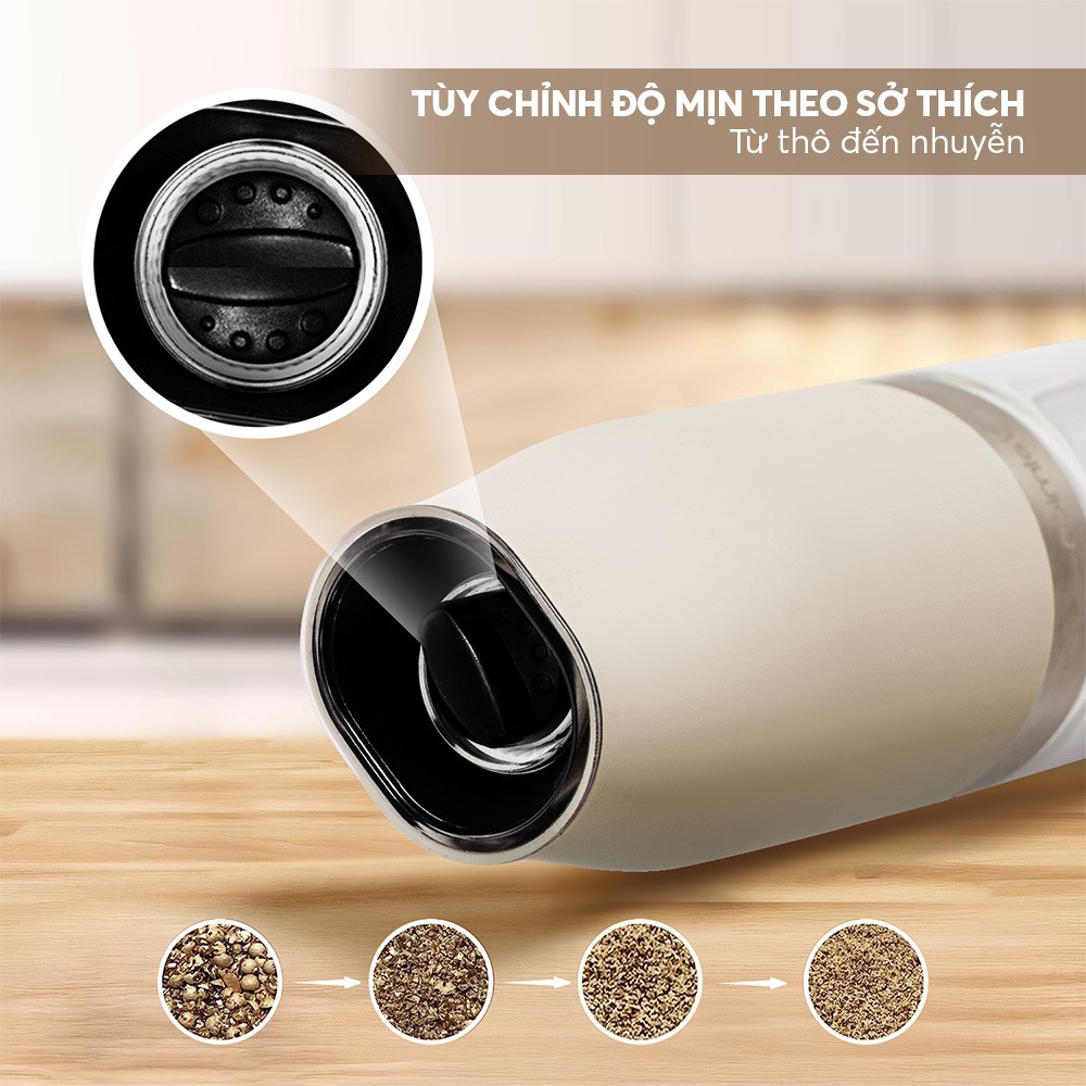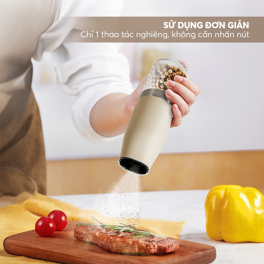 Không cần xoay tay, không cần nhấn nút. Sản phẩm tích hợp cảm biến thông minh, tự động xay khi nghiêng lọ tiêu 90 độ, và ngừng xay khi đặt thẳng đứng. Một thao tác đơn giản nhưng vô cùng tiện lợi, đặc biệt với những người nội trợ bận rộn.