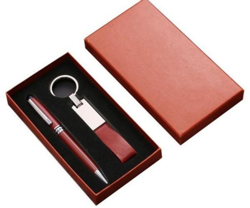 Option 1: Bộ quà tặng móc khóa da và bút khắc logo - hộp in nhũ logo