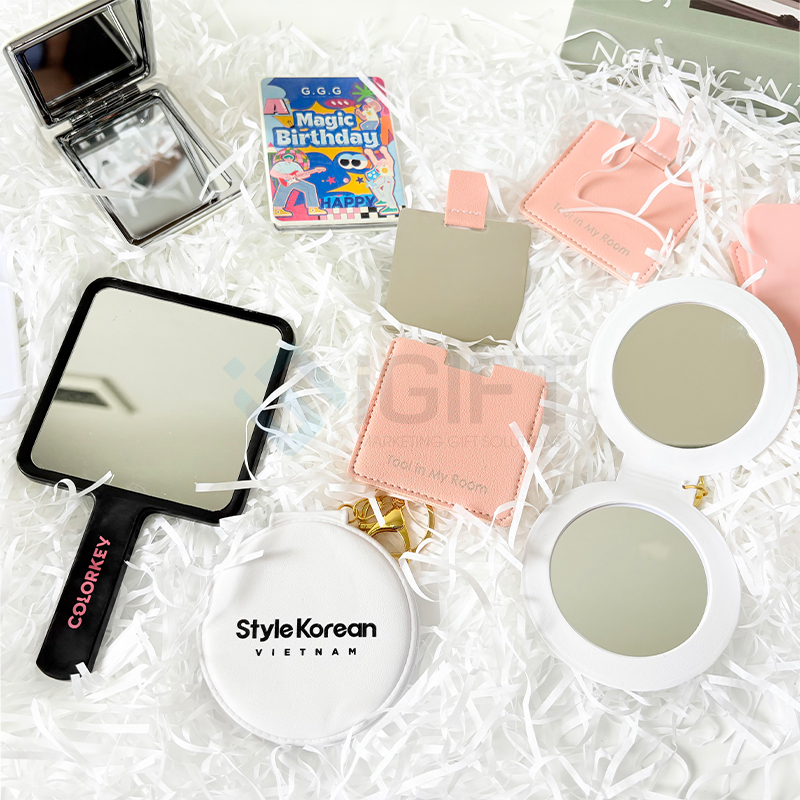 Chọn chất liệu và hình dáng: Tại iGIFT có nhiều hình dáng, chất liệu như: gương tròn, gương vuông, hình trái tim, gương gập, gương bầu dục... chất liệu nhựa ABS, da PU, gỗ,...cho các thương hiệu lựa chọn.