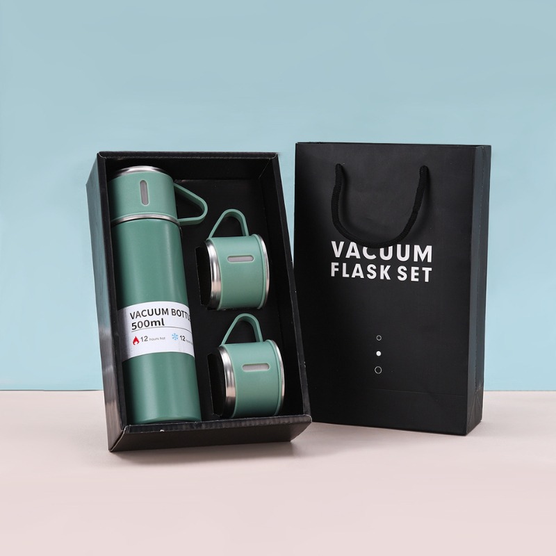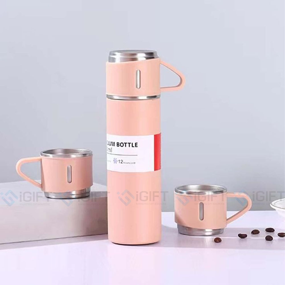 Set gồm 1 bình giữ nhiệt dung tích 500ml và 3 cốc dung tích 200ml, rất phù hợp cho nhu cầu sử dụng trong văn phòng, dã ngoại, họp nhóm hoặc làm quà tặng cá nhân. Thiết kế nắp kín chống tràn, khả năng giữ nhiệt nóng/lạnh từ 6 – 12 tiếng, đảm bảo mang đến trải nghiệm sử dụng tiện lợi và thoải mái cho người nhận. Bộ sản phẩm có kích thước tổng thể 76cm x 44cm x 28cm, gọn gàng và dễ dàng đóng gói, vận chuyển.
