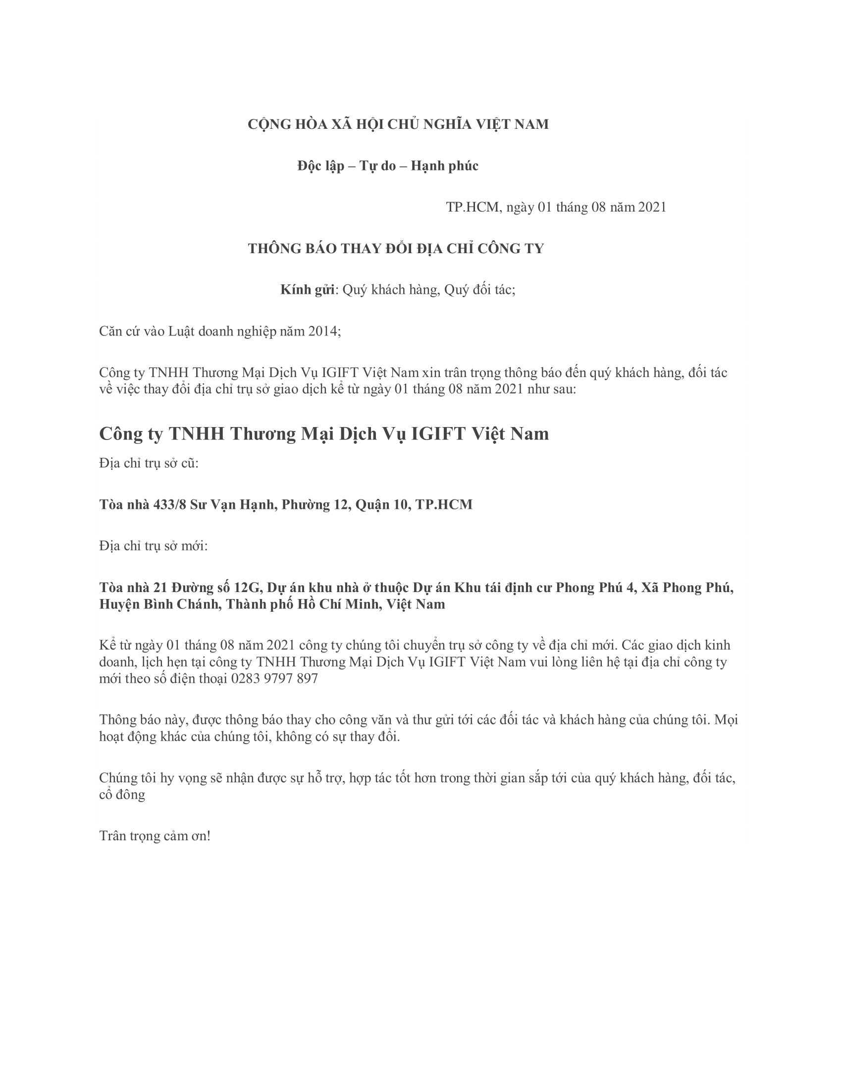 Từ ngày 1.8.2021, Công ty TNHH Thương Mại Dịch Vụ IGIFT Việt Nam xin trân trọng thông báo đến quý đối tác và quý khách hàng về việc công ty chúng tôi thay đổi từ địa chỉ trụ sở công ty cũ : 433/8 Sư Vạn Hạnh Phường 12, Quận 10. về địa chỉ : Tòa nhà 21 Đường số 12G, Dự án khu nhà ở thuộc Dự án Khu tái định cư Phong Phú 4, Xã Phong Phú, Huyện Bình Chánh, Thành phố Hồ Chí Minh, Việt Nam